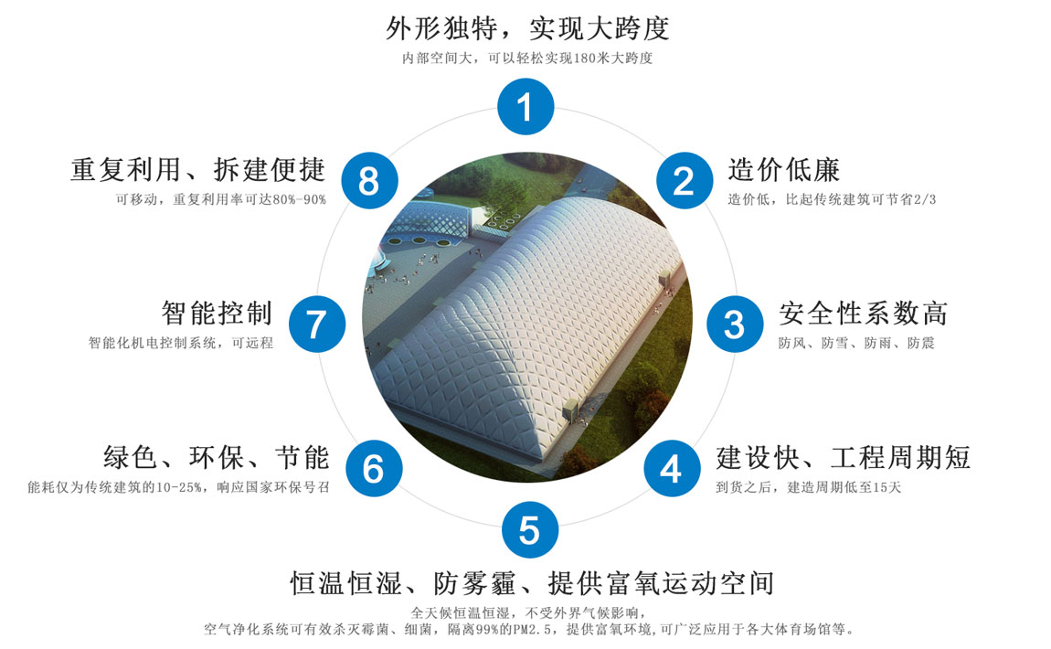 氣膜建筑場地等環(huán)境適應(yīng)能力強(qiáng),建設(shè)快,能應(yīng)用在各個領(lǐng)域